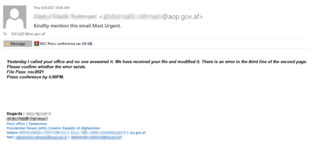 เว็บไซต์ zdnet.com รายงานเมื่อ 1 ก.ค.64 ว่า Check Point Research หน่วยงานดูแลด้านข้อมูลภัยคุกคามของบริษัท Check Point ของสหรัฐฯ ระบุว่า กลุ่มแฮกเกอร์จีนได้โจมตีทางไซเบอร์ต่อรัฐบาลอัฟกานิสถาน โดยการแอบอ้างเป็นประธานาธิบดีอัฟกานิสถานแล้ว ส่งอีเมลหลอกลวงแบบเฉพาะเจาะจง (Spear phishing email) ให้เจ้าหน้าที่รัฐบาลอัฟกานิสถาน โดยอีเมลดังกล่าวได้รับออกแบบมาเพื่อแทรกซึมหน่วยงานของรัฐ และประสบความสำเร็จ นำไปสู่การบุกรุกระบบคอมพิวเตอร์ของสำนักงานสภาความมั่นคงแห่งชาติอัฟกานิสถาน รายละเอียดในอีเมลหลอกลวงนั้น แอบอ้างว่าเป็นอีเมลจากสำนักงานประธานาธิบดีอัฟกานิสถานและมีเนื้อหาโดยขอให้มีการตรวจสอบแก้ไขเอกสารที่เกี่ยวข้องกับงานแถลงข่าวที่จะเกิดขึ้นโดยด่วน ซึ่งอีเมลดังกล่าวได้แนบไฟล์สกุล.RAR ที่ป้องกันด้วยรหัสผ่าน ชื่อไฟล์ NSC Press conference.rar หากเหยื่อคลิกเปิดไฟล์ดังกล่าว มัลแวร์ dropper (เป็นมัลแวร์ที่โปรแกรมป้องกันไวรัสตรวจไม่พบ) ที่แฝงอยู่ในไฟล์จะแพร่กระจายเข้าสู่ระบบคอมพิวเตอร์ พร้อมทั้งติดตั้งมัลแวร์ xCaon สำหรับเจาะช่องโหว่ (backdoor) ที่จะไปแก้ไขค่ารีจิสเตอร์ของระบบคอมพิวเตอร์ เพื่อสร้างช่องทางในการดาวน์โหลดและอับโหลดไฟล์ ผ่านเครื่องคอมพิวเตอร์แม่ข่าย เพื่อขโมยข้อมูลสำคัญ คาดว่าผู้ที่โจมตีคือกลุ่มแฮกเอร์ IndigoZebra ซึ่งมีประวัติในการมุ่งเป้าไปที่กลุ่มประเทศในเครืออดีตสหภาพโซเวียต อาทิ อุซเบกิสถานและคีร์กีซสถาน ที่มา https://www.zdnet.com/article/chinese-hacking-group-impersonates-afghan-president-to-infiltrate-government-agencies/