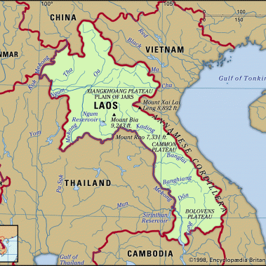 ภูมิประเทศ แบ่งออกเป็น 3 เขต คือ เขตภูเขาสูง อยู่ในเขตภาคเหนือของประเทศ เขตที่ราบสูง พื้นที่ ตอ.ต. ของประเทศ มีที่ราบสูงขนาดใหญ่ 3 แห่ง ได้แก่ ที่ราบสูงเมืองพวน ที่ราบสูงนากาย และที่ราบสูงบอละเวน และ เขตที่ราบลุ่ม เป็นเขตที่ราบตามแนวฝั่งแม่น้ำโขงและแม่น้ำต่าง ๆ เป็นพื้นที่ที่มีความอุดมสมบูรณ์มาก ลาวมีแม่น้ำโขงเป็นแม่น้ำสำคัญ ระยะทาง 1,898 กม. มีความสำคัญทั้งด้านเกษตรกรรม ประมง การผลิตกระแสไฟฟ้า การคมนาคม และเป็นพรมแดนธรรมชาติระหว่างลาวกับเพื่อนบ้าน