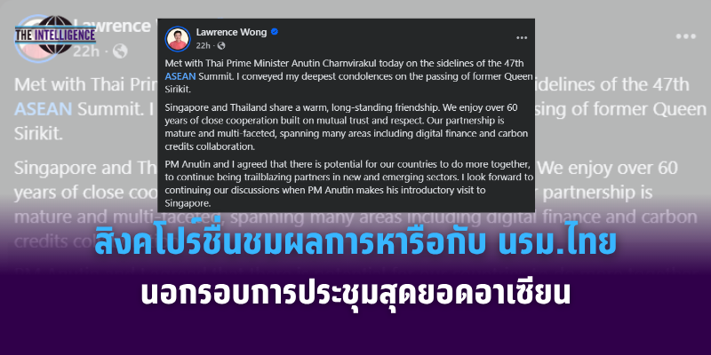 นายลอว์เรนซ์ หว่อง นรม.สิงคโปร์ระบุผ่านเฟซบุ๊กและอินสตาแกรมส่วนตัวเมื่อ 27 ต.ค.68 ว่าได้พบหารือนอกรอบการประชุมสุดยอดอาเซียนกับ นายอนุทิน ชาญวีรกูล นรม. โดยแสดงความเสียใจอย่างสุดซึ้งต่อการสวรรคตของสมเด็จพระนางเจ้าสิริกิติ์ พระบรมราชินีนาถ พระบรมราชชนนีพันปีหลวง และชื่นชมความร่วมมืออย่างใกล้ชิดกับไทยที่มีมามากกว่า 60 ปี บนพื้นฐานของความไว้วางใจและเคารพกันและกัน โดยความร่วมมือมีความเข้มแข็งและหลากหลาย ครอบคลุมด้านการเงินดิจิทัลและคาร์บอนเครดิต ทั้งสองฝ่ายยังเห็นพ้องที่จะสานต่อความเป็นพันธมิตรผู้บุกเบิกในภาคส่วนใหม่ๆ และจะได้หารือมากขึ้นในโอกาสที่ นรม.อนุทินจะเยือนสิงคโปร์อย่างเป็นทางการต่อไป ขณะที่นายสิริพงศ์ อังคสกุลเกียรติ โฆษกประจำสำนักนายกรัฐมนตรี เปิดเผยรายละเอียดเพิ่มเติมว่า สิงคโปร์ยินดีที่จะส่งผู้แทนเข้าร่วมการประชุมปราบปรามอาชญากรรมออนไลน์ ที่ นรม.มีดำริจะจัดขึ้น ขณะที่ นรม.อนุทินตอบรับคำเชิญเยือนสิงคโปร์อย่างเป็นทางการใน 7 พ.ย.68 โดยสองฝ่ายเตรียมจะลงนาม MOU ระหว่างกันในเรื่องการค้าข้าวระหว่างการเยือนด้วย