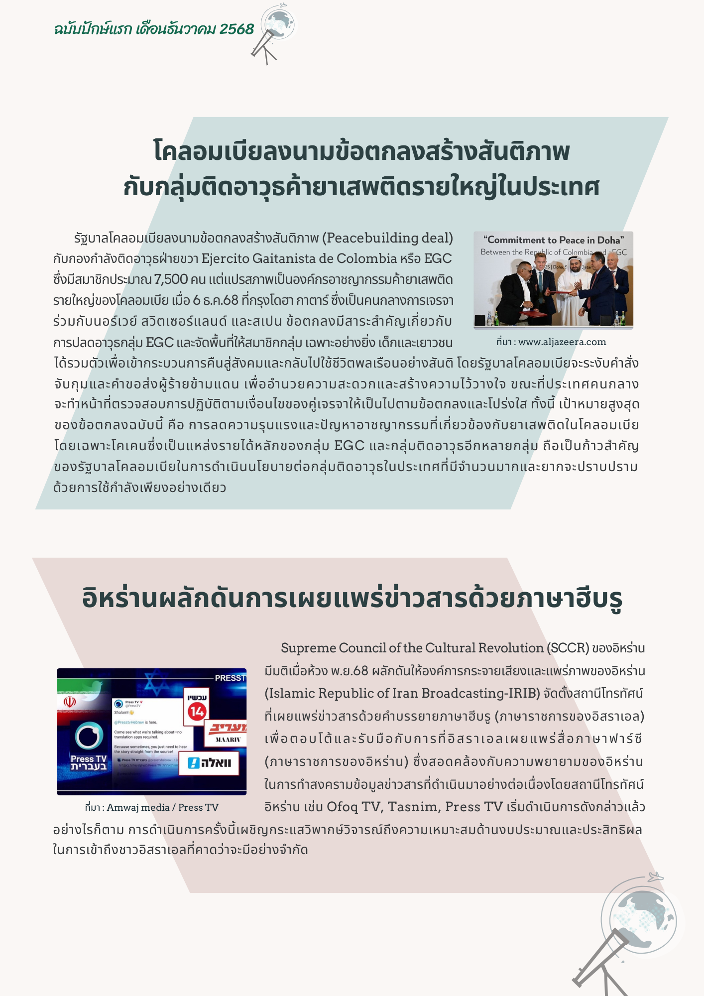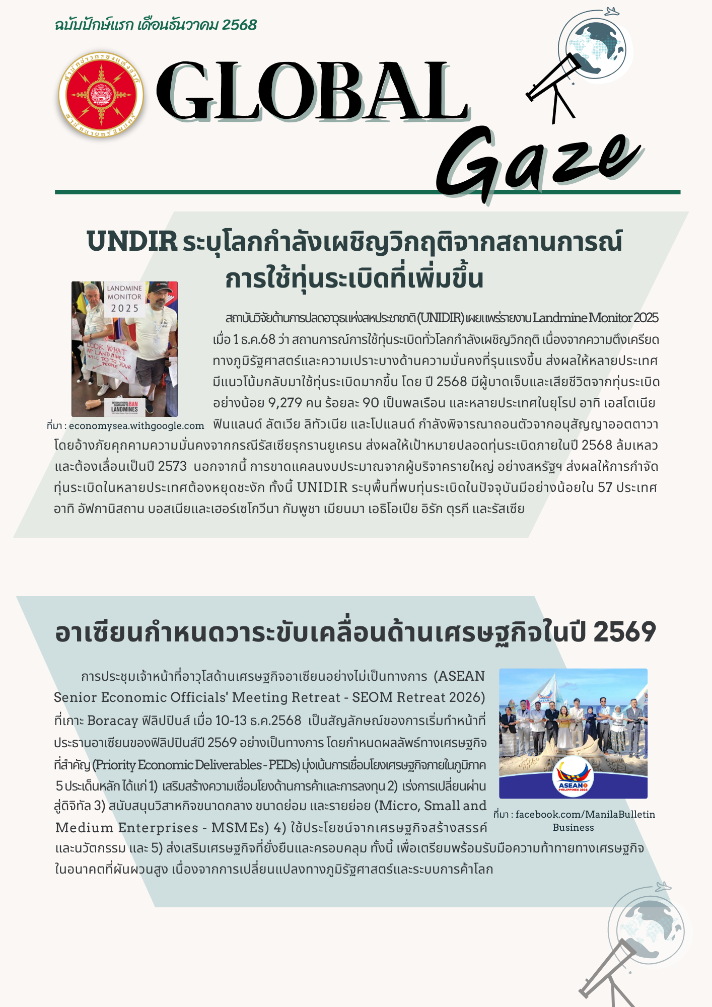 Category: Global GazeBy The Intelligence Team15 December 2025 Share this post Share on FacebookShare on Facebook Share on XShare on X Pin itShare on Pinterest Share on LinkedInShare on LinkedIn Author: The Intelligence Team Post navigationPreviousPrevious post:WFP เตือนว่าเมียนมาจะเผชิญภาวะอดอยากยิ่งขึ้นในปี 2569NextNext post:รอบรั้วอาคเนย์ ปักษ์แรก ธ.ค.68Related postsGlobal Gaze ปักษ์หลัง พ.ย.681 December 2025Global Gaze ปักษ์แรก พ.ย.6815 November 2025Global Gaze ปักษ์หลัง ต.ค.6830 October 2025Global Gaze ปักษ์แรก ต.ค.6815 October 2025Global Gaze ปักษ์หลัง ก.ย.6830 September 2025Global Gaze ปักษ์แรก ก.ย.6815 September 2025